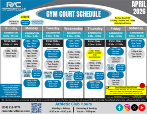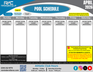 Important Announcement: The Natatorium (Pool and Splash Pad Areas) will be closed, beginning, Wednesday, August 13, 2025. The Natatorium will be undergoing maintenance and repairs, to enhance your experience at the Reminderville Athletic Club.